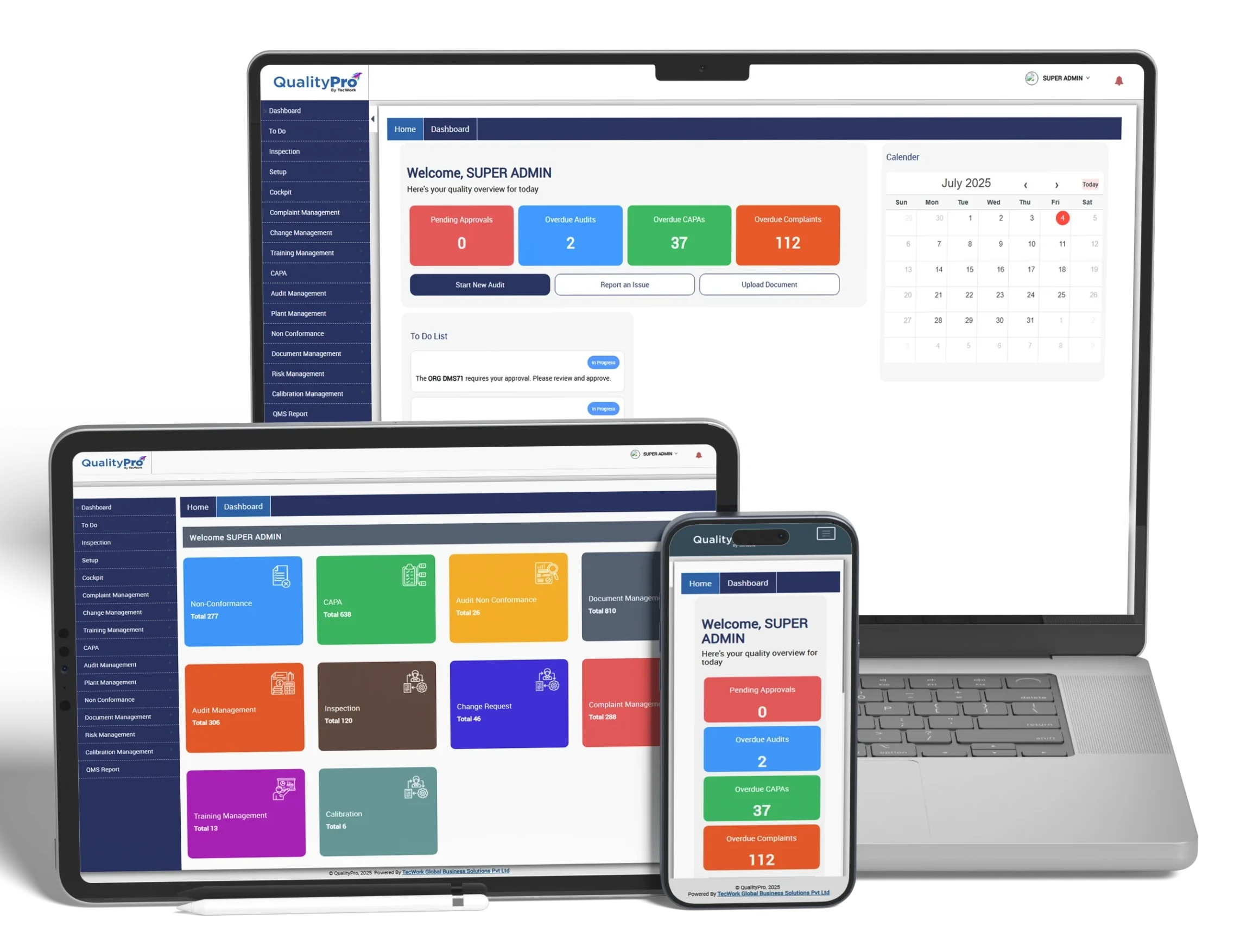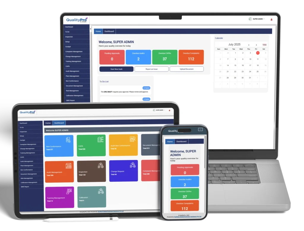 QualityPro by TecWork is a cloud-based Quality Management Software (QMS) designed to help organizations manage, maintain, and improve the quality of their products and processes. It centralizes and digitizes all quality-related activities—such as document control, SOP implementation, audits, CAPAs, training, inspections, calibration, and complaint handling—onto a single platform.